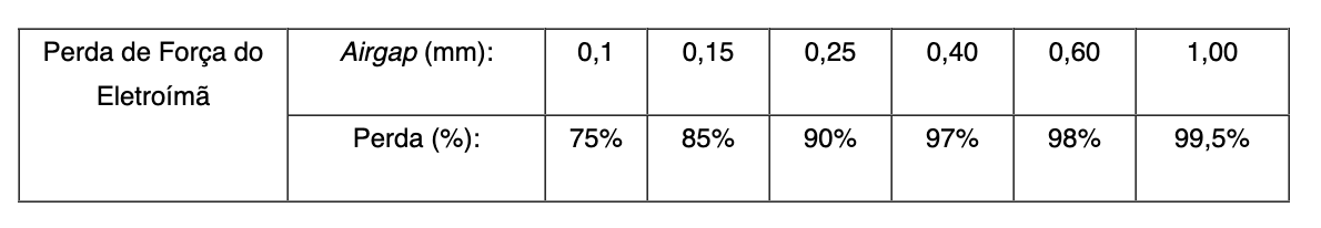 d) A medida que se aumenta o airgap (espaço de ar entre a superfície do eletroímã e a contra-placa onde ele se fixará), há uma substancial redução da força de atração. Veja abaixo tabela aproximada de perda de força do eletroímã em função do airgap:
